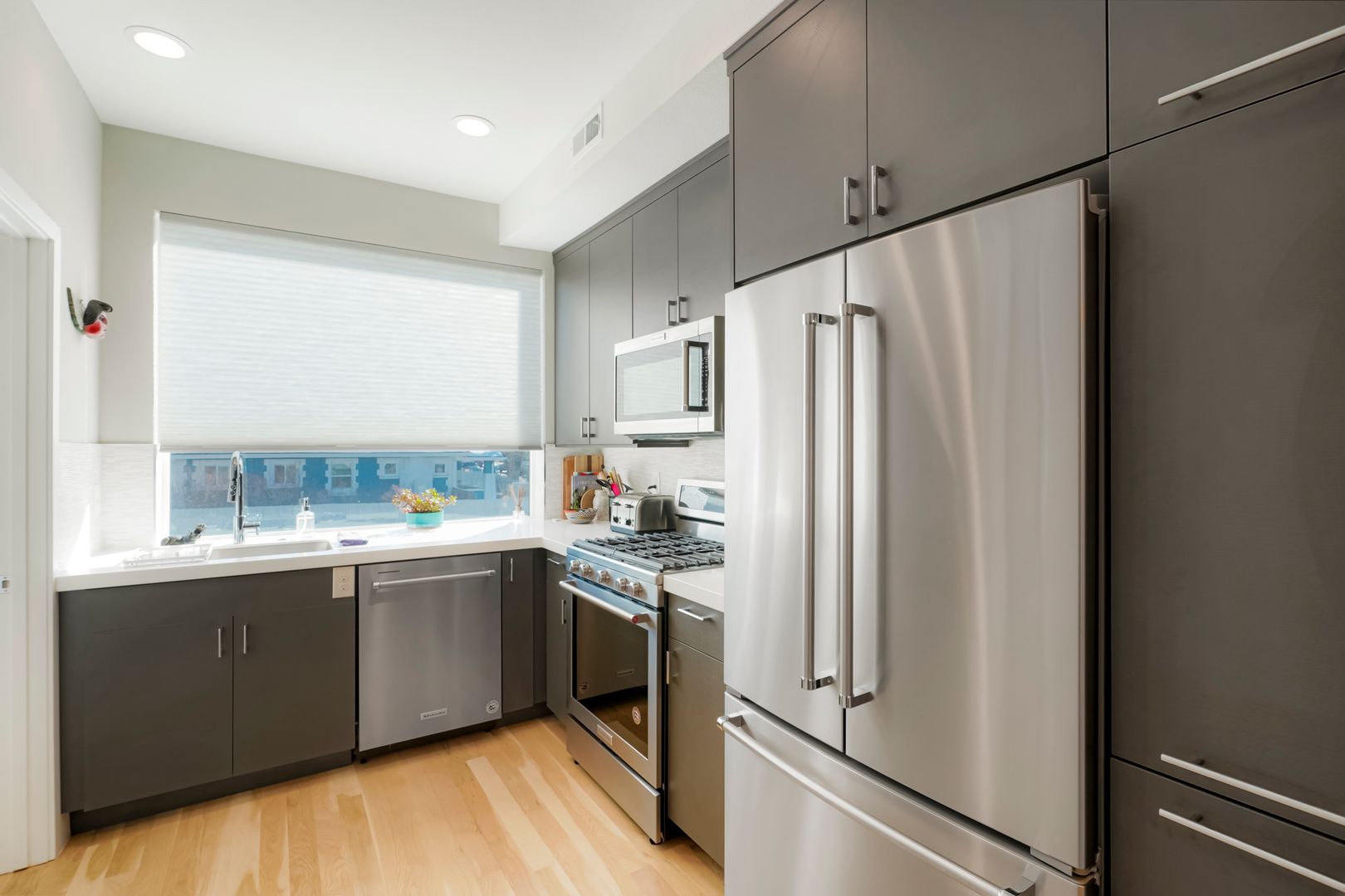 The kitchen is equipped with stainless steel appliances, modern cabinetry, and an open design that flows into the living space, complete with central air conditioning for year-round comfort. One of the home’s standout features is the private rooftop deck, where you can enjoy sweeping views of the Front Range—perfect for relaxing, entertaining, or outdoor dining.