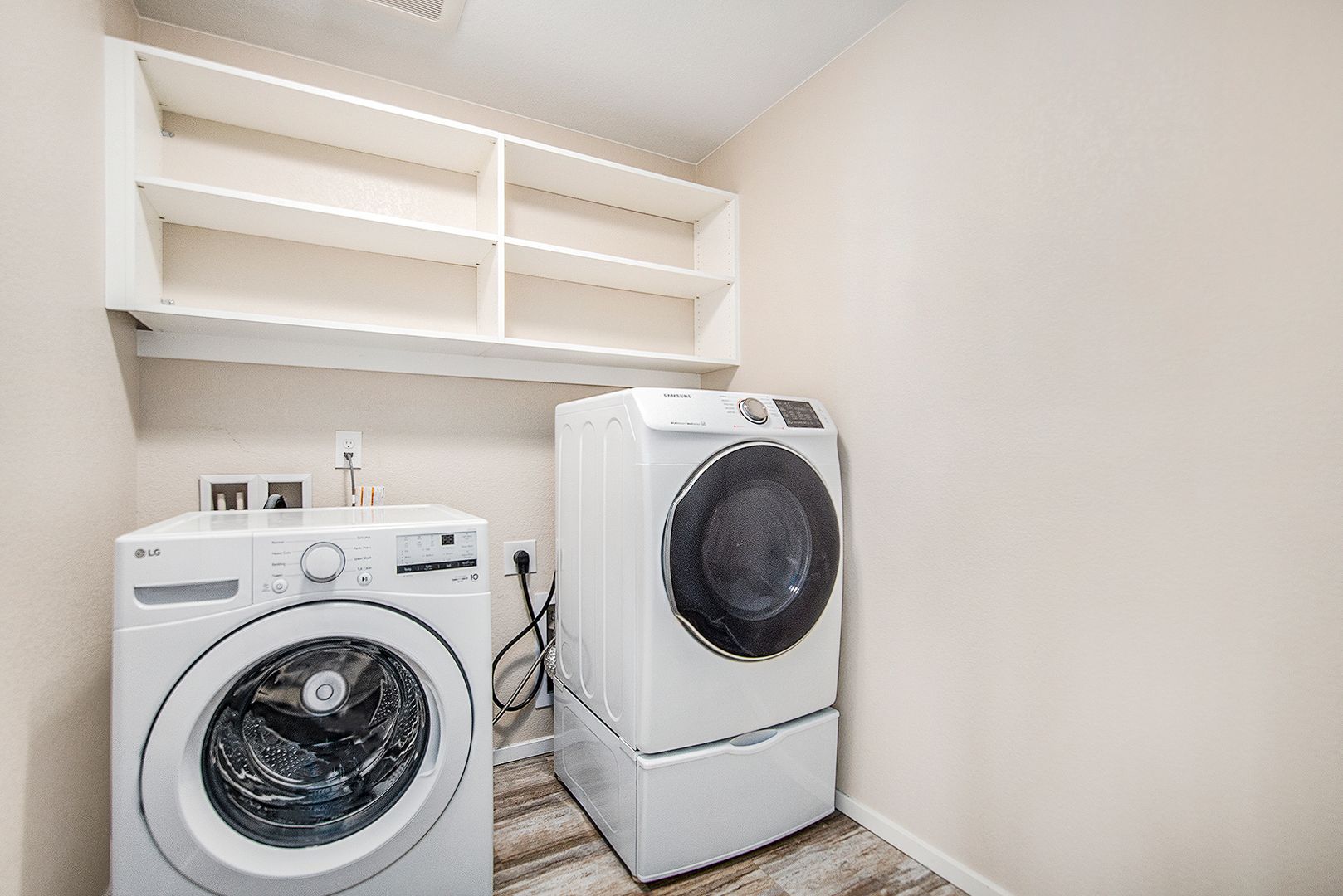In the kitchen you will find stainless steel appliances, quartz countertops, custom cabinets, and a large kitchen island which all flows seamlessly to the living and dining area, and to the outside where you will find a fenced in patio.